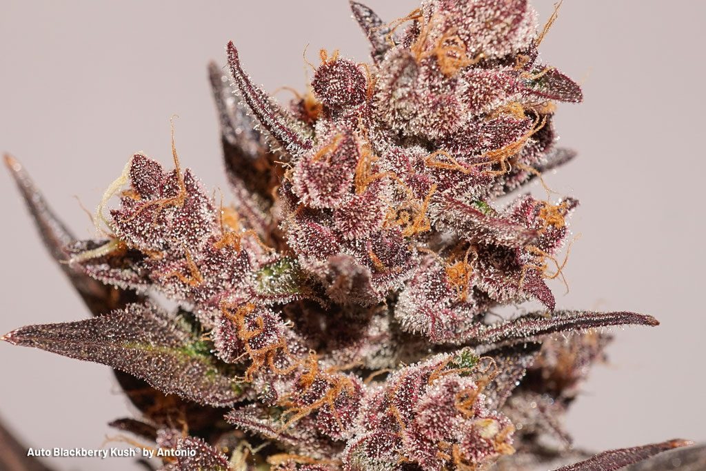 The buds of Auto Blackberry Kush look simply amazing! They have a great bag appeal, the contrasting colours and nice resin coating makes this a real winner for visual bud quality. The buds are quite compact, although looking slightly more like a Sativa than an Indica. They are dense though and a small bud definitely goes a long way!
