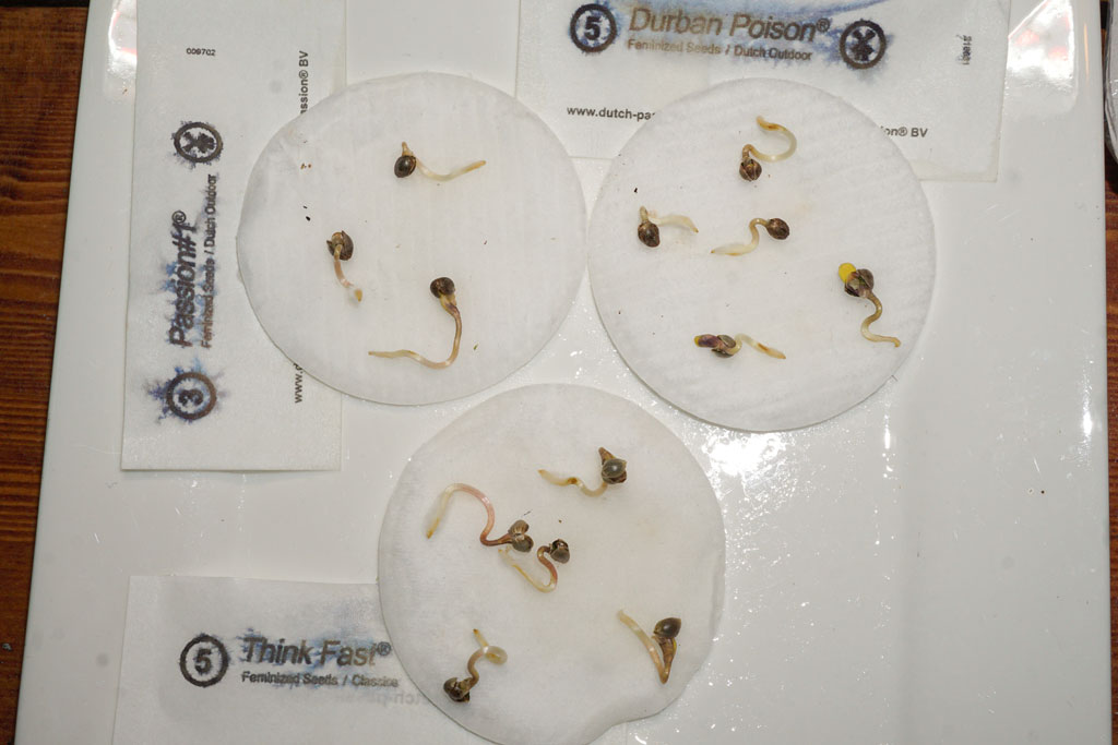 We took 16 photoperiod feminised outdoor cannabis seeds in total. We chose to grow some of the classic Dutch Outdoor strains like Purple #1, Durban Poison, Frisian Dew, Passion #1 and Think Fast. All 16 seeds germinated, and we had another 100% germination rate. Using the cotton-pad germination technique is really the easiest and most successful method we have used during all those years of growing. Just make sure you buy proper cotton pads, use uncontaminated water and place the dish in the dark at room temperature. Don’t forget to place some microwave cellophane foil (preferably with tiny holes in it) on top of the plate to retain the moisture.